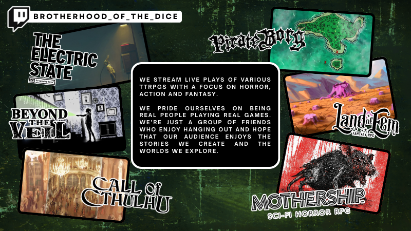 Brotherhood of the Dice is a group of friends who get together to play tabletop RPGs, mostly leaning into horror with a sprinkling of fantasy and sci-fi. We run games like