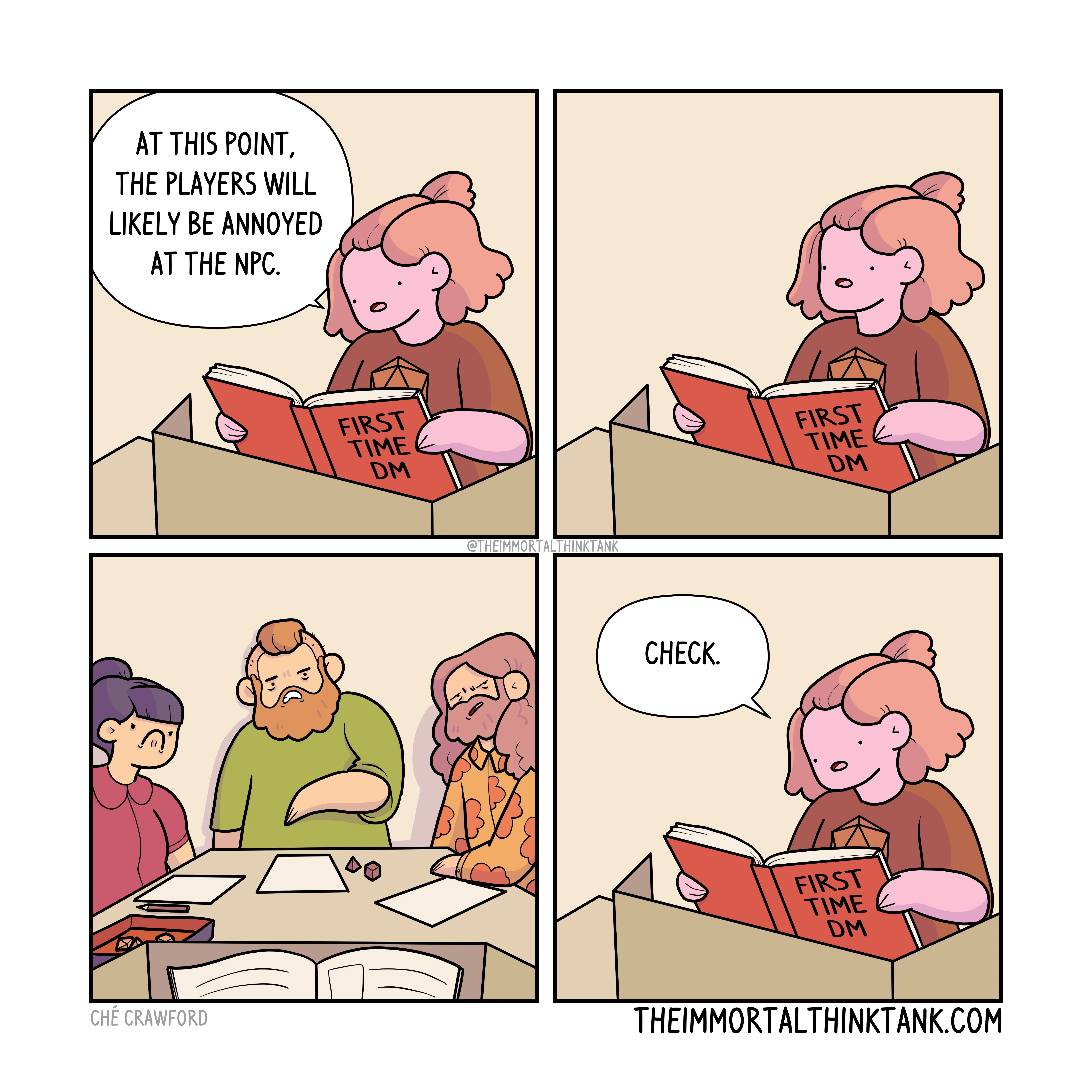 You are there to react to their actions and tell them what happens next. That’s it. If your players end the game session feeling happy with how they spent their time, you’ve won as a DM.