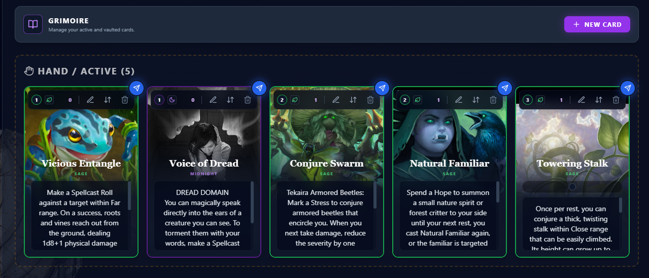 Use the "Card Builder" to create visually rich ability cards, mimicking physical ones. Organize by dragging between your "Active Hand" and the "Vault".
