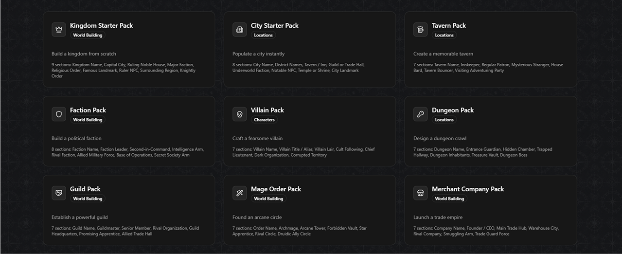 Generate themed bundles of related content to jumpstart kingdoms, cities, taverns, factions, villains, and other fantasy concepts.